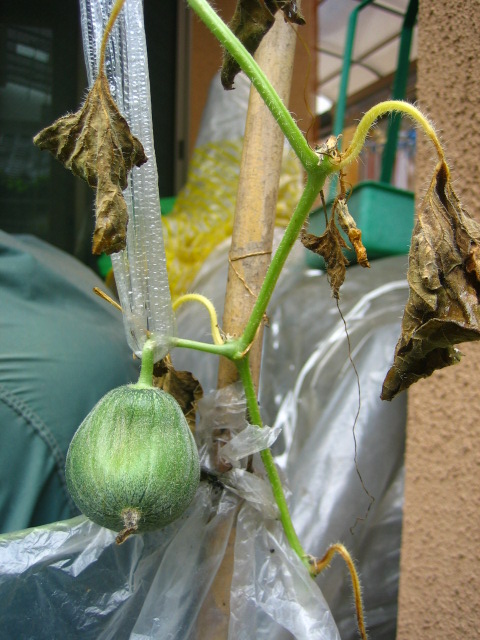 これは小玉メロンですが 立派なマスクメロンを夢見てました。惜しかったんですよ!あと少しで網が入りそうなのもあったんですよ。まぁね いてまえ精神で何でも手をつけるんですが 路地いや露地そのままでメロンなんて土台無理だったんです。毎日午前中の豪雨で株元がすっかり腐りました。次はもちょっと事前研究が必要(と、いつも思う)